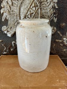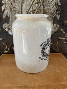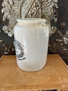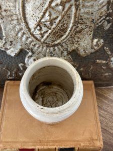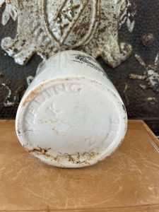 These is a very rare Shape piece. It is an authentic antique advertising pot sourced during my recent buying trip to England. I have been sourcing these wonderful antique pots for over 12 years from sources who are actually digging them up in ancient rubbish sites all over England. I purchased my first antique Advertising pot when my husband and I had the wonderful opportunity to live in England in the 1980’s. Our daughter was born there and we enjoyed living in England so much we often went back to visit after returning to the US.