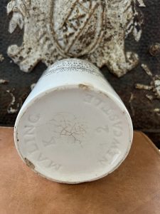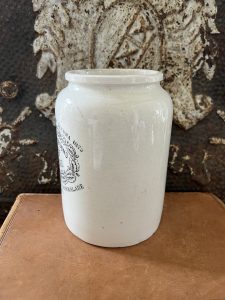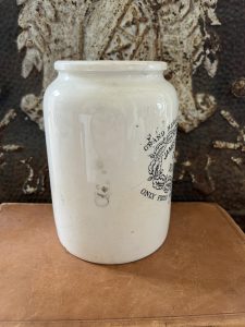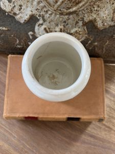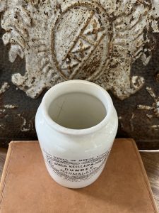These is a very rare Shape piece. It is an authentic antique advertising pot sourced during my recent buying trip to England. I have been sourcing these wonderful antique pots for over 12 years from sources who are actually digging them up in ancient rubbish sites all over England. I purchased my first antique Advertising pot when my husband and I had the wonderful opportunity to live in England in the 1980’s. Our daughter was born there and we enjoyed living in England so much we often went back to visit after returning to the US.