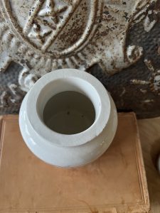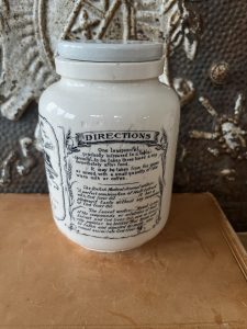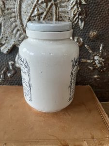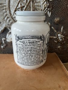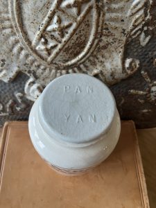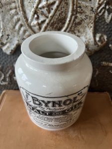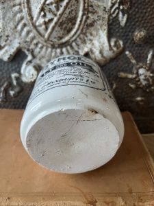 This is an authentic antique advertising pot sourced during my recent buying trip to England. I have been sourcing these wonderful antique pots for over 12 years from sources who are actually digging them up in ancient rubbish sites all over England. I purchased my first antique Advertising pot when my husband and I had the wonderful opportunity to live in England in the 1980’s. Our daughter was born there and we enjoyed living in England so much we often went back to visit after returning to the US.