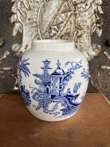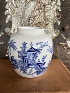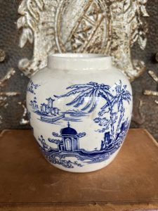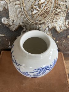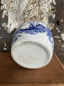 Listed is this large size beautiful ancient Ginger Jar. This beautiful handmade jar with its dark blue transfer is in great antique condition with very minor ware and no chips or cracks. Ginger jars are depicted by their high-shoulders, rounded shapes, and small mouths. Although they were originally used to store and transport spices, hence their name, the containers (which typically don’t include handles) have been used primarily as decorative objects since the 19th century.