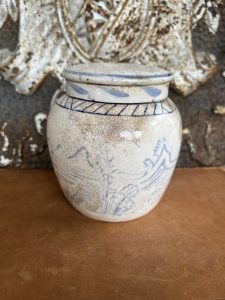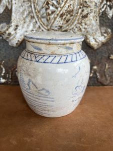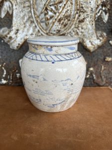 Listed is this beautiful ancient smaller sized Ginger Jar with lid. This beautiful handmade jar is in good antique condition with a lovely blue and white hand painted scene. It has age related crazing throughout and other age related marks with a beautiful shiny gloss finish still apparent. The base has one chip on the top rim that doesn’t show with the lid on. The lid is in good condition with age related spotting.