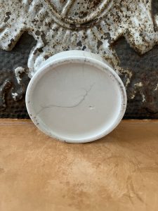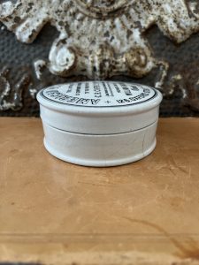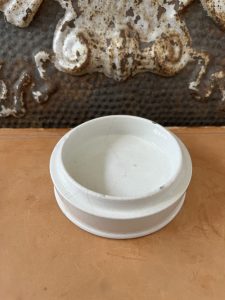 This is an authentic antique advertising pot sourced during my recent buying trip to England. I have been sourcing these wonderful antique pots for over 12 years from friends who are actually digging them up in ancient rubbish sites all over England. I purchased my first antique Advertising pot when my husband and I had the wonderful opportunity to live in England in the 1980’s. Our daughter was born there and we enjoyed living in England so much we often went back to visit after returning to the US.