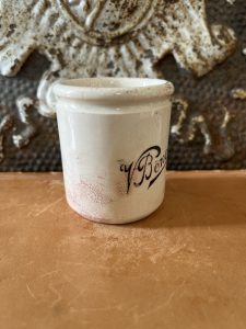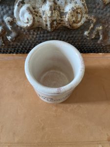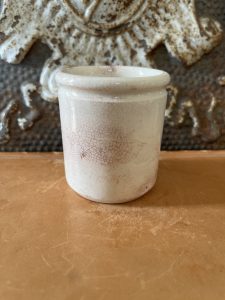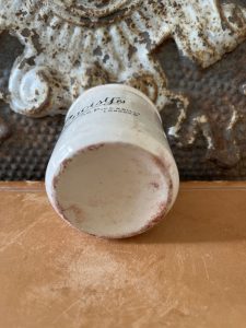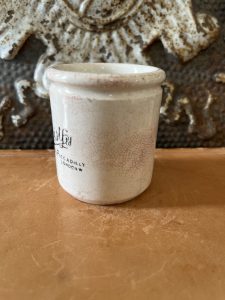 This is an authentic antique advertising pot sourced during my recent buying trip to England. I have been sourcing these wonderful antique pots for over 12 years from sources who are actually digging them up in ancient rubbish sites all over England. I purchased my first antique Advertising pot when my husband and I had the wonderful opportunity to live in England in the 1980’s. Our daughter was born there and we enjoyed living in England so much we often went back to visit after returning to the US.