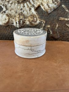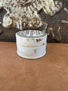 This is an authentic antique advertising pot sourced during my recent buying trip to England. I have been sourcing these wonderful antique pots for over 12 years from sources who are actually digging them up in ancient rubbish sites all over England. I purchased my first antique Advertising pot when my husband and I had the wonderful opportunity to live in England in the 1980’s. Our daughter was born there and we enjoyed living in England so much we often went back to visit after returning to the US.