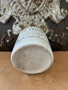 This is an authentic antique advertising pot sourced during my recent buying trip to England. I have been sourcing these wonderful antique pots for over 12 years from sources who are actually digging them up in ancient rubbish sites all over England. I purchased my first antique Advertising pot when my husband and I had the wonderful opportunity to live in England in the 1980’s. Our daughter was born there and we enjoyed living in England so much we often went back to visit after returning to the US.