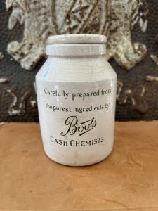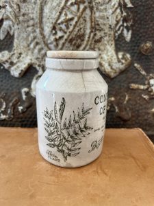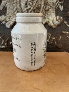 This is an authentic antique advertising pot sourced during my recent buying trip to England. I have been sourcing these wonderful antique pots for over 12 years from sources who are actually digging them up in ancient rubbish sites all over England. I purchased my first antique Advertising pot when my husband and I had the wonderful opportunity to live in England in the 1980’s. Our daughter was born there and we enjoyed living in England so much we often went back to visit after returning to the US.