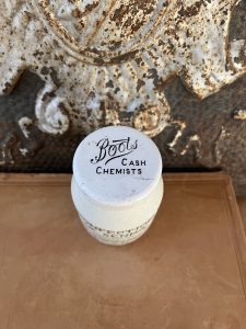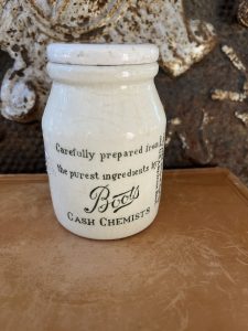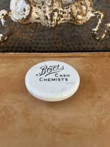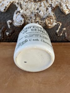 This is an authentic antique advertising pot sourced during my recent buying trip to England. I have been sourcing these wonderful antique pots for over 12 years from sources who are actually digging them up in ancient rubbish sites all over England. I purchased my first antique Advertising pot when my husband and I had the wonderful opportunity to live in England in the 1980’s. Our daughter was born there and we enjoyed living in England so much we often went back to visit after returning to the US.