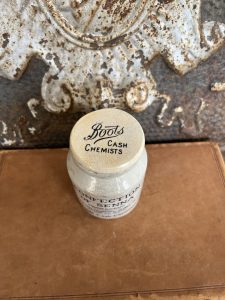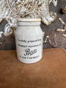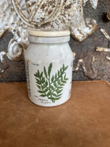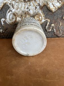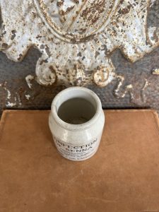 This is an authentic antique advertising pot sourced during my recent buying trip to England. I have been sourcing these wonderful antique pots for over 12 years from sources who are actually digging them up in ancient rubbish sites all over England. I purchased my first antique Advertising pot when my husband and I had the wonderful opportunity to live in England in the 1980’s. Our daughter was born there and we enjoyed living in England so much we often went back to visit after returning to the US.