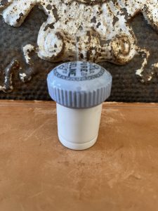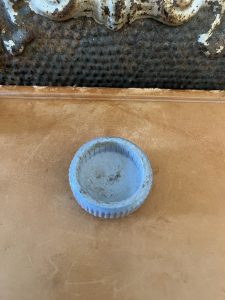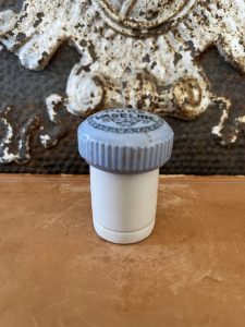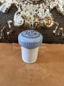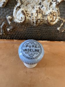 This offering is for this Antique Button Top Lid – PURE VASELINE, Powder Blue Ironstone w/ base. Vaseline was first introduced by Robert Chesebrough in 1872. It became widely used for its healing and moisturizing properties. This rare button top lid fits nicely on top of the base. It is in very good condition, with no cracks or chips.