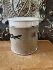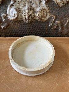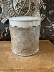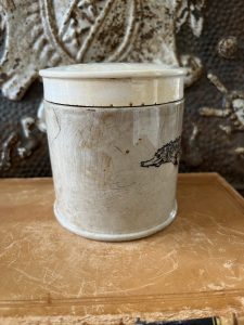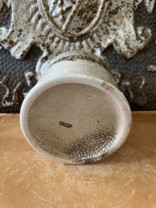This is an authentic antique English advertising pot sourced during my recent buying trip to England. I have been sourcing these wonderful pots for over 12 years from friends who are actually digging them up in ancient rubbish sites all over England. I purchased my first antique Advertising pot when my husband and I had the wonderful opportunity to live in England in the 1980’s. Our daughter was born there and we enjoyed living in England so much we often went back to visit after returning to the US.