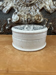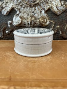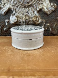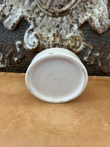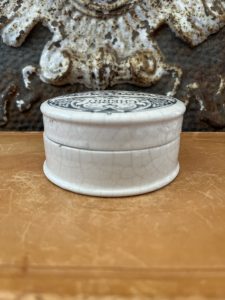 This is an authentic antique advertising pot sourced during my recent buying trip to England. I have been sourcing these wonderful antique pots for over 12 years from friends who are actually digging them up in ancient rubbish sites all over England. I purchased my first antique Advertising pot when my husband and I had the wonderful opportunity to live in England in the 1980’s. Our daughter was born there and we enjoyed living in England so much we often went back to visit after returning to the US.