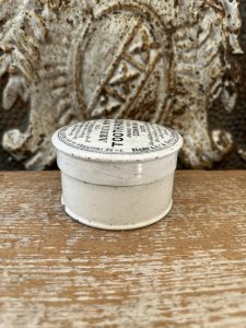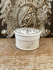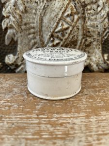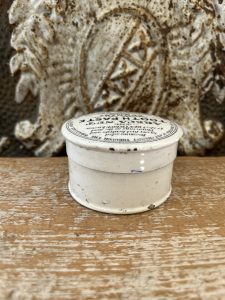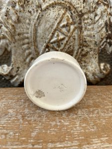 This is an authentic antique advertising pot sourced during my recent buying trip to England. I have been sourcing these wonderful antique pots for over 12 years from friends who are actually digging them up in ancient rubbish sites all over England. I purchased my first antique Advertising pot when my husband and I had the wonderful opportunity to live in England in the 1980’s. Our daughter was born there and we enjoyed living in England so much we often went back to visit after returning to the US.