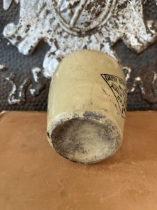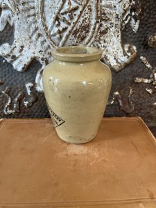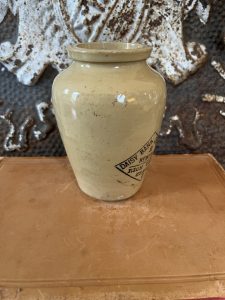 This is an authentic antique advertising pot sourced during my recent buying trip to England. I have been sourcing these wonderful antique pots for over 12 years from friends who are actually digging them up in ancient rubbish sites all over England. I purchased my first antique Advertising pot when my husband and I had the wonderful opportunity to live in England in the 1980’s. Our daughter was born there and we enjoyed living in England so much we often went back to visit after returning to the US.