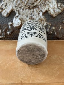 This is an authentic antique advertising pot sourced during my recent buying trip to England. I have been sourcing these wonderful antique pots for over 12 years from friends who are actually digging them up in ancient rubbish sites all over England. I purchased my first antique Advertising pot when my husband and I had the wonderful opportunity to live in England in the 1980’s. Our daughter was born there and we enjoyed living in England so much we often went back to visit after returning to the US.