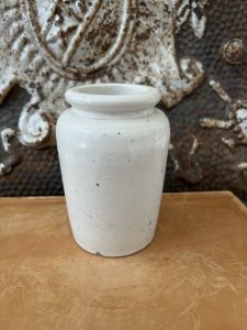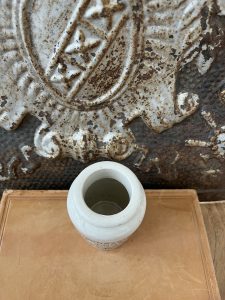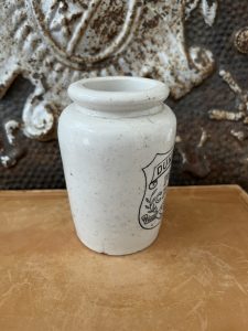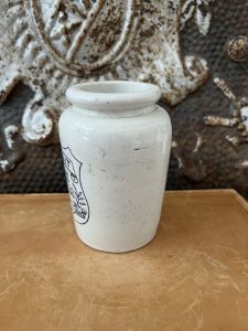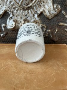 This is an authentic antique advertising pot sourced during my recent buying trip to England. I have been sourcing these wonderful antique pots for over 12 years from friends who are actually digging them up in ancient rubbish sites all over England. I purchased my first antique Advertising pot when my husband and I had the wonderful opportunity to live in England in the 1980’s. Our daughter was born there and we enjoyed living in England so much we often went back to visit after returning to the US.