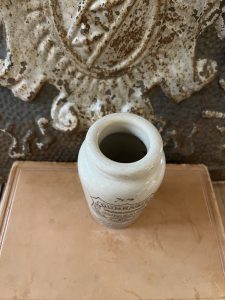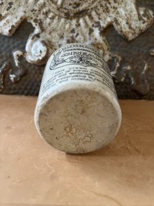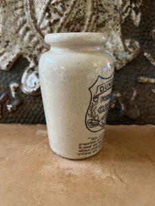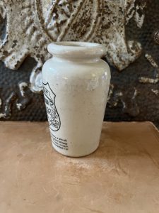 This is an authentic antique advertising pot sourced during my recent buying trip to England. I have been sourcing these wonderful antique pots for over 12 years from friends who are actually digging them up in ancient rubbish sites all over England. I purchased my first antique Advertising pot when my husband and I had the wonderful opportunity to live in England in the 1980’s. Our daughter was born there and we enjoyed living in England so much we often went back to visit after returning to the US.