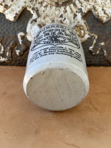 This is an authentic antique advertising pot sourced during my recent buying trip to England. I have been sourcing these wonderful antique pots for over 12 years from friends who are actually digging them up in ancient rubbish sites all over England. I purchased my first antique Advertising pot when my husband and I had the wonderful opportunity to live in England in the 1980’s. Our daughter was born there and we enjoyed living in England so much we often went back to visit after returning to the US.