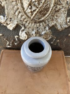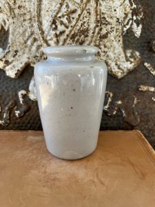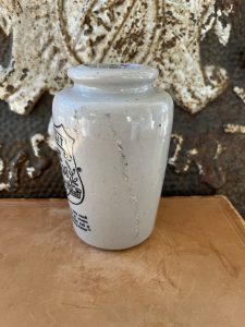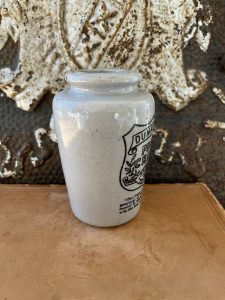 This is an authentic antique advertising pot sourced during my recent buying trip to England. I have been sourcing these wonderful antique pots for over 12 years from friends who are actually digging them up in ancient rubbish sites all over England. I purchased my first antique Advertising pot when my husband and I had the wonderful opportunity to live in England in the 1980’s. Our daughter was born there and we enjoyed living in England so much we often went back to visit after returning to the US.