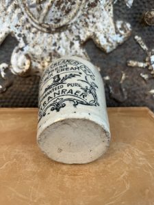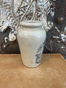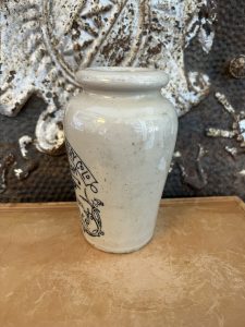 This is an authentic antique advertising pot sourced during my recent buying trip to England. I have been sourcing these wonderful antique pots for over 12 years from friends who are actually digging them up in ancient rubbish sites all over England. I purchased my first antique Advertising pot when my husband and I had the wonderful opportunity to live in England in the 1980’s. Our daughter was born there and we enjoyed living in England so much we often went back to visit after returning to the US.