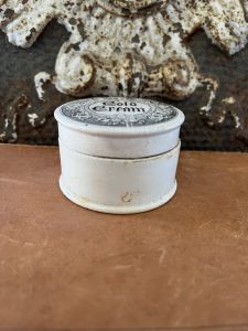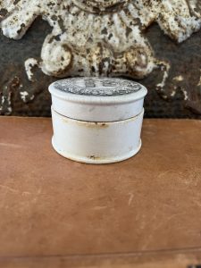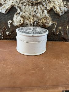 This is an authentic antique advertising pot sourced during my recent buying trip to England. I have been sourcing these wonderful antique pots for over 12 years from sources who are actually digging them up in ancient rubbish sites all over England. I purchased my first antique Advertising pot when my husband and I had the wonderful opportunity to live in England in the 1980’s. Our daughter was born there and we enjoyed living in England so much we often went back to visit after returning to the US.