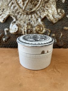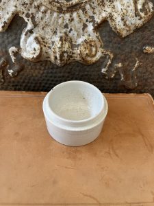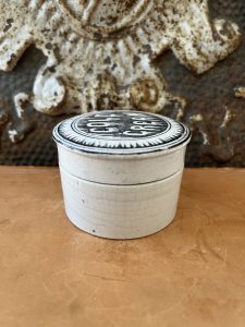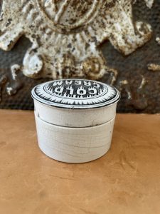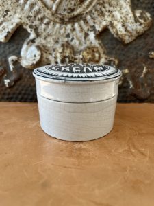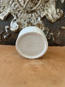 This is an authentic antique advertising pot sourced during my recent buying trip to England. I have been sourcing these wonderful antique pots for over 12 years from friends who are actually digging them up in ancient rubbish sites all over England. I purchased my first antique Advertising pot when my husband and I had the wonderful opportunity to live in England in the 1980’s. Our daughter was born there and we enjoyed living in England so much we often went back to visit after returning to the US.