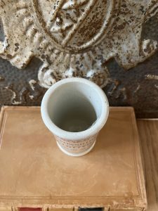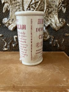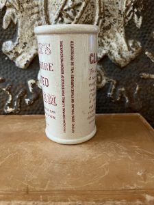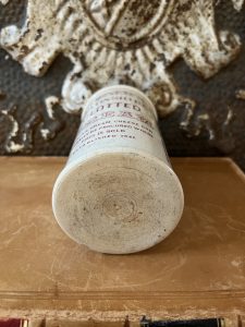 This authentic antique advertising pot was sourced during my recent buying trip to England. I have been sourcing these wonderful antique pots for over 12 years from friends who are actually digging them up in ancient rubbish sites all over England. I purchased my first antique Advertising pot when my husband and I had the wonderful opportunity to live in England in the 1980’s. Our daughter was born there and we enjoyed living in England so much we often went back to visit after returning to the US.