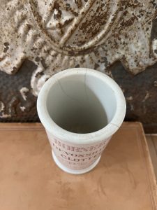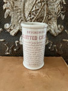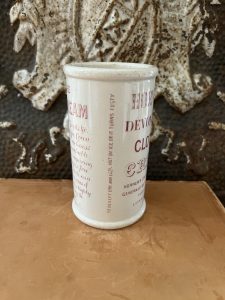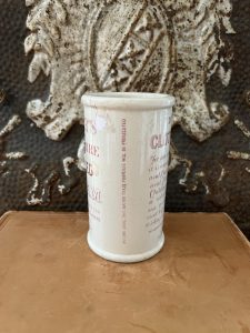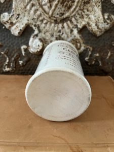 This authentic antique advertising pot was sourced during my recent buying trip to England. I have been sourcing these wonderful antique pots for over 12 years from friends who are actually digging them up in ancient rubbish sites all over England. I purchased my first antique Advertising pot when my husband and I had the wonderful opportunity to live in England in the 1980’s. Our daughter was born there and we enjoyed living in England so much we often went back to visit after returning to the US.