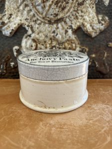 This listing is for one (1) Burgess’s Anchovy Paste Lidded Pot w/ CANDLE. These charming Antique English Advertising Pots date back to the late 1800’s and was the packaging of that eras prepared foods. This paste would have been eaten on toast or biscuits. The different crests represent different Kings.