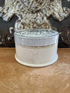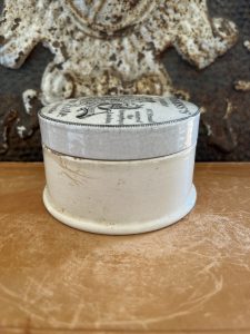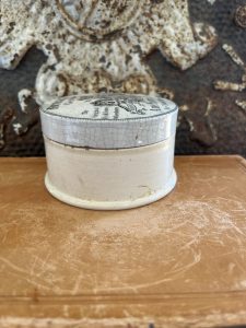 These are authentic antique advertising pot sourced during my recent buying trip to England. I have been sourcing these wonderful antique pots for over 12 years from friends who are actually digging them up in ancient rubbish sites all over England. I purchased my first antique Advertising pot when my husband and I had the wonderful opportunity to live in England in the 1980’s. Our daughter was born there and we enjoyed living in England so much we often went back to visit after returning to the US.