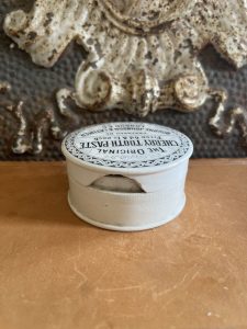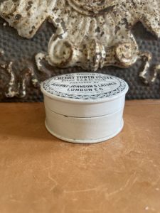 Offering this rare Bourne Johnson & Latimer, London, Lidded pot w/base. Bring a touch of Victorian charm to your home decor or collection with this beautiful 19th-century toothpaste pot lid. Featuring the original design of “The Original Cherry Tooth Paste – Price 6d & 1s each – Prepared by Bourne Johnson & Latimer, London E.C.”, this piece is a faithful tribute to classic English toiletry packaging. Before modern tubes, toothpaste was often sold in these pots and were sold by chemists and apothecaries. Cherry Toothpaste was a popular flavor. Bourne Johnson & Latimer was a London-based pharmaceutical company operating in the 19th century. “London E.C.” refers to the Eastern Central postal district of London, a common business address in that period.