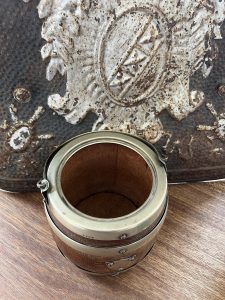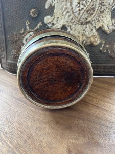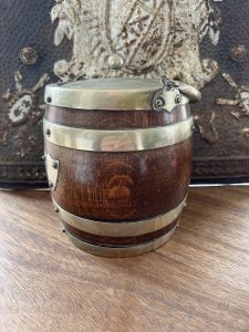 This lovely antique English Wood Oak Biscuit Barrel is in good condition, with some general ware showing on the metal areas