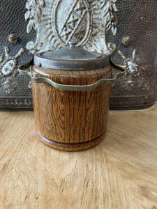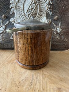This lovely antique English Wood Oak Biscuit Barrel with white ironstone insert is in good condition, with some ware showing around the top