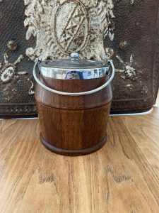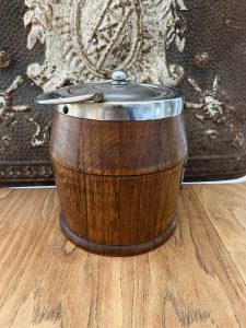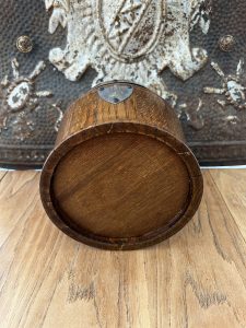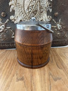 This lovely antique English Wood Oak Biscuit Barrel with white ironstone insert is in very good condition with one of the seems showing a small separation on the right side. These became fashionable during the Victorian period, when taking tea with biscuits (cookies in the U.S.) became a social ritual. The jar was kept on the tea table and used to serve biscuits to guests during afternoon tea. I just acquired this lovely piece during my recent buying trip in England.