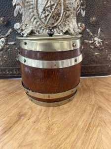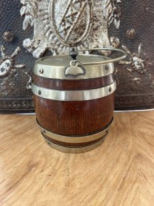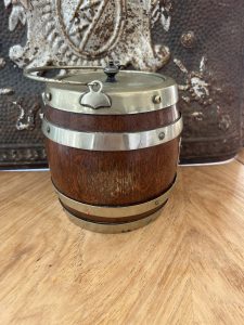 This lovely antique English Wood Oak Biscuit Barrel with white ironstone insert is in very good condition. These became fashionable during the Victorian period, when taking tea with biscuits (cookies in the U.S.) became a social ritual. The jar was kept on the tea table and used to serve biscuits to guests during afternoon tea. The picture included with the multiple pots is not the actual one here and is shown just for ideas of how something may be displayed. Really a standout in the kitchen, as barware, or with other collectible displays.