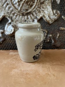 These are all authentic antique advertising pots sourced during my recent buying trip to England. I have been sourcing these wonderful antique pots for over 12 years from friends who are actually digging them up in ancient rubbish sites all over England. I purchased my first antique Advertising pot when my husband and I had the wonderful opportunity to live in England in the 1980’s. Our daughter was born there and we enjoyed living in England so much we often went back to visit after returning to the US.