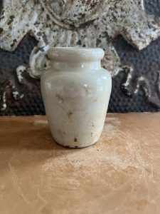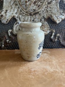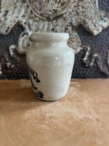 These are all authentic antique advertising pots sourced during my recent buying trip to England. I have been sourcing these wonderful antique pots for over 12 years from friends who are actually digging them up in ancient rubbish sites all over England. I purchased my first antique Advertising pot when my husband and I had the wonderful opportunity to live in England in the 1980’s. Our daughter was born there and we enjoyed living in England so much we often went back to visit after returning to the US.