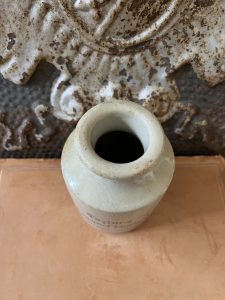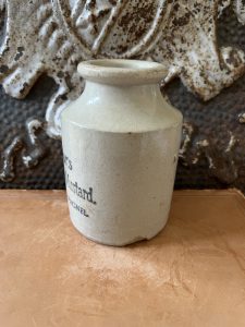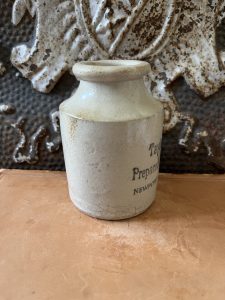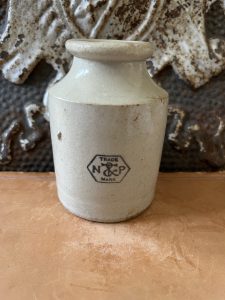 This is an authentic antique advertising pot sourced during my recent buying trip to England. I have been sourcing these wonderful antique pots for over 12 years from sources who are actually digging them up in ancient rubbish sites all over England. I purchased my first antique Advertising pot when my husband and I had the wonderful opportunity to live in England in the 1980’s. Our daughter was born there and we enjoyed living in England so much we often went back to visit after returning to the US.
