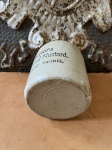 Antique English Advertising Mustard Pot – Putty Colored Stone Jar from the late 1800’s. Taylor’s Prepared Mustard was a regional mustard producer based in Newport Pagnell, a market town in Buckinghamshire, England. On the back is a hexagonal trademark marked:
