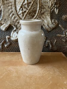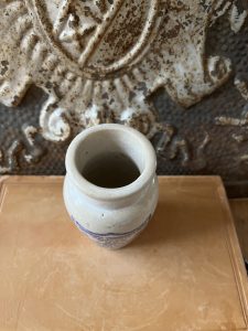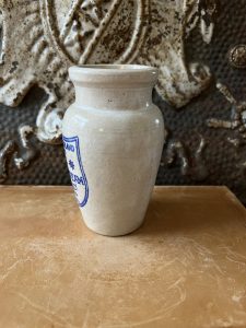 This is an authentic antique advertising pot sourced during my recent buying trip to England. I have been sourcing these wonderful antique pots for over 12 years from friends who are actually digging them up in ancient rubbish sites all over England. I purchased my first antique Advertising pot when my husband and I had the wonderful opportunity to live in England in the 1980’s. Our daughter was born there and we enjoyed living in England so much we often went back to visit after returning to the US.