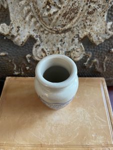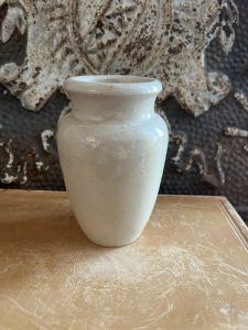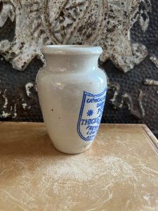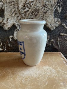 This is an authentic antique advertising pot sourced during my recent buying trip to England. I have been sourcing these wonderful antique pots for over 12 years from friends who are actually digging them up in ancient rubbish sites all over England. I purchased my first antique Advertising pot when my husband and I had the wonderful opportunity to live in England in the 1980’s. Our daughter was born there and we enjoyed living in England so much we often went back to visit after returning to the US.