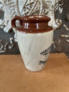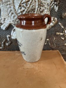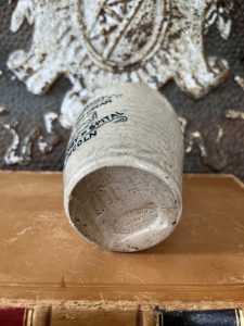 This is an authentic antique advertising pot sourced during my recent buying trip to England. I have been sourcing these wonderful antique pots for over 12 years from friends who are actually digging them up in ancient rubbish sites all over England. I purchased my first antique Advertising pot when my husband and I had the wonderful opportunity to live in England in the 1980’s. Our daughter was born there and we enjoyed living in England so much we often went back to visit after returning to the US.