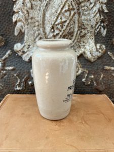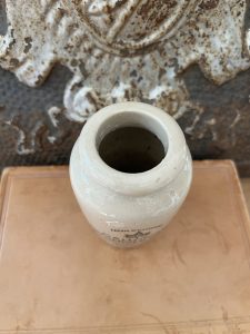 This is an authentic antique advertising pot sourced during my recent buying trip to England. I have been sourcing these wonderful antique pots for over 12 years from friends who are actually digging them up in ancient rubbish sites all over England. I purchased my first antique Advertising pot when my husband and I had the wonderful opportunity to live in England in the 1980’s. Our daughter was born there and we enjoyed living in England so much we often went back to visit after returning to the US.