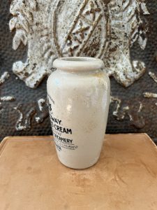 Offering this Antique Earthenware Galloway Preserved Cream Stoneware Pot, Stranraer on Loch Ryan, Scotland. Reads: “Gathered Daily at the Galloway Creamery Where the Fresh Butter is Churned.” Fresh cream without preservatives was recommended for children and invalids. The pot is in good overall condition with one chip on the top lip front as shown.