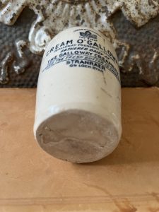 Offering this Antique Earthenware Galloway Preserved Cream Stoneware Pot, Stranraer on Loch Ryan, Scotland. Reads: “Gathered Daily at the Galloway Creamery Where the Fresh Butter is Churned.” Fresh cream without preservatives was recommended for children and invalids. The pot is in very good overall condition with one chip on the. a k inside rim.