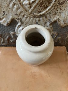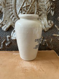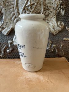 This is an authentic antique advertising pot sourced during my recent buying trip to England. I have been sourcing these wonderful antique pots for over 12 years from friends who are actually digging them up in ancient rubbish sites all over England. I purchased my first antique Advertising pot when my husband and I had the wonderful opportunity to live in England in the 1980’s. Our daughter was born there and we enjoyed living in England so much we often went back to visit after returning to the US.