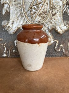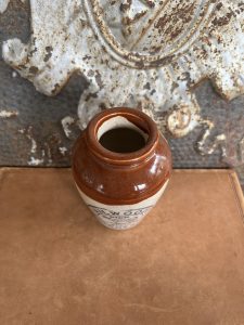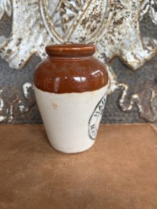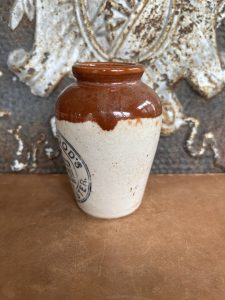 This is an authentic antique advertising pot sourced during my recent buying trip to England. I have been sourcing these wonderful antique pots for over 12 years from sources who are actually digging them up in ancient rubbish sites all over England. I purchased my first antique Advertising pot when my husband and I had the wonderful opportunity to live in England in the 1980’s. Our daughter was born there and we enjoyed living in England so much we often went back to visit after returning to the US.