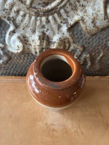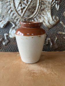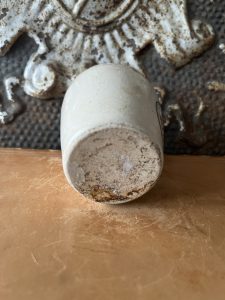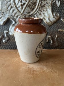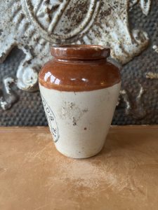 This is an authentic antique advertising pot sourced during my recent buying trip to England. I have been sourcing these wonderful antique pots for over 12 years from sources who are actually digging them up in ancient rubbish sites all over England. I purchased my first antique Advertising pot when my husband and I had the wonderful opportunity to live in England in the 1980’s. Our daughter was born there and we enjoyed living in England so much we often went back to visit after returning to the US.