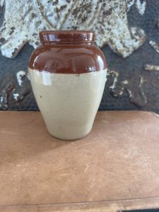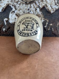 The two-tone salt-glazed (brown top, cream base) was a popular style for cream and preserve jars. The cow motif and wording “Rich Cream” served both as branding and a guarantee of quality. This pot is in great condition with no chips or cracks.