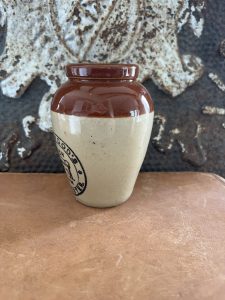 This is an authentic antique advertising pot sourced during my recent buying trip to England. I have been sourcing these wonderful antique pots for over 12 years from sources who are actually digging them up in ancient rubbish sites all over England. I purchased my first antique Advertising pot when my husband and I had the wonderful opportunity to live in England in the 1980’s. Our daughter was born there and we enjoyed living in England so much we often went back to visit after returning to the US.