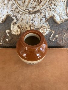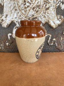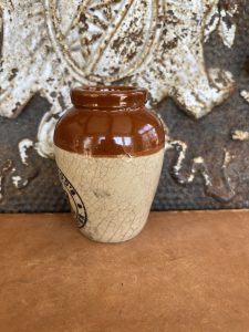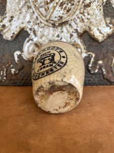 This is an authentic antique advertising pot sourced during my recent buying trip to England. I have been sourcing these wonderful antique pots for over 12 years from sources who are actually digging them up in ancient rubbish sites all over England. I purchased my first antique Advertising pot when my husband and I had the wonderful opportunity to live in England in the 1980’s. Our daughter was born there and we enjoyed living in England so much we often went back to visit after returning to the US.